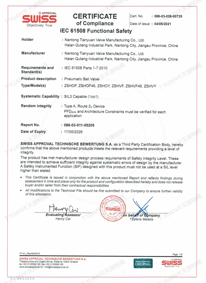 SIL認證證書-切斷球閥1