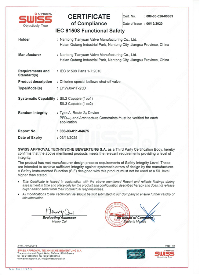 SIL認(rèn)證證書(shū)-液氯專用波紋管切斷閥1